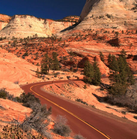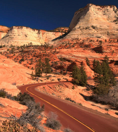 Canyon’s steep red cliffs. Zion Canyon Scenic Drive cuts through its main